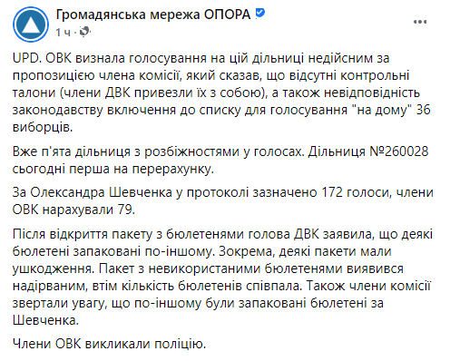 "В частности, некоторые пакеты имели повреждения. Пакет с неиспользованными бюллетенями оказался надорванным, однако количество бюллетеней совпало. Также члены комиссии обращали внимание, что по-другому были упакованы бюллетени за Шевченко", - добавили в "Опоре".