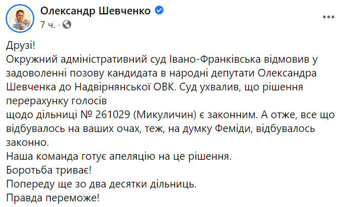 "Наша команда готовит апелляцию на это решение (о признании победы Вирастюка - Ред.). Борьба продолжается! Впереди еще два десятка участков", - сообщил Шевченко.