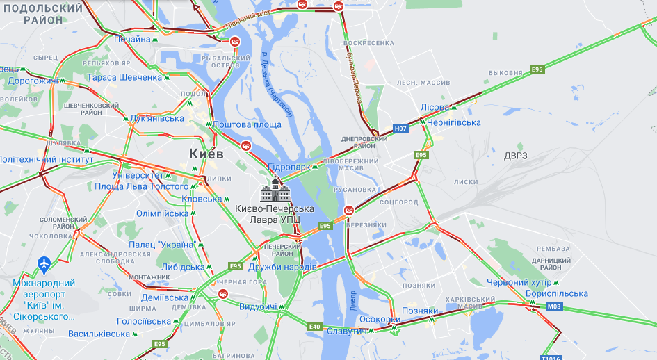 09:12 Данные по заторам на Google-maps показывают образование пробок на всех киевских мостах. Также движение сковывают массовые ДТМ -на пр. Соборности, ул. Андрея Малышко, Набережном шоссе.