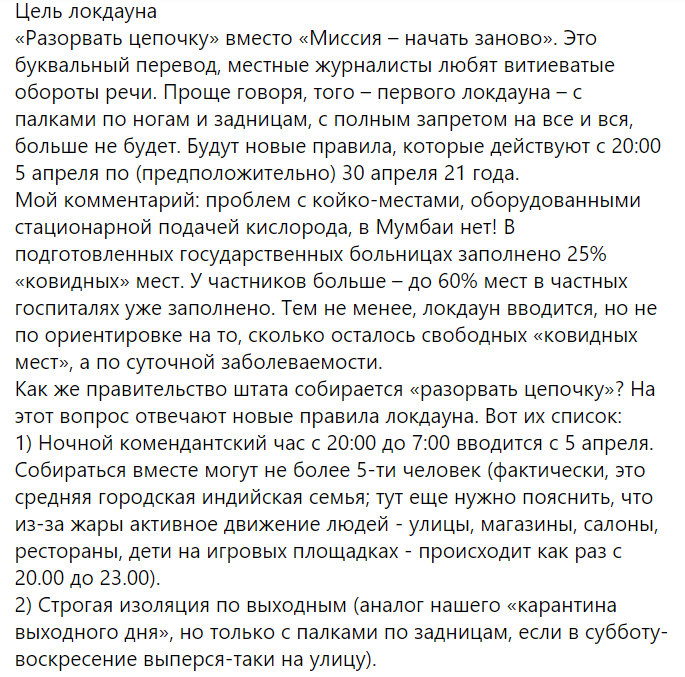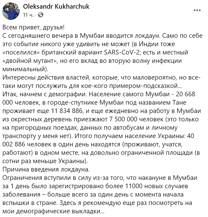 "В подготовленных государственных больницах заполнено 25% «ковидных» мест. В частных госпиталях больше – до 60% мест. Тем не менее, локдаун вводится, но не по ориентировке на то, сколько осталось свободных «ковидных мест», а по суточной заболеваемости. Накануне в Мумбаи за 1 день было зарегистрировано более 11 000 новых случаев заболевания – больше всего за один день с момента начала вспышки в стране", - пишет Кухарчук.
