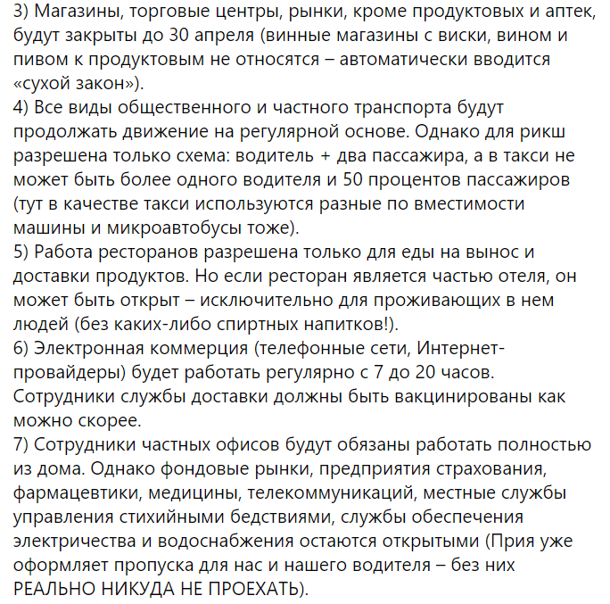 Ночной комендантский час - с 20:00 до 7:00. Собираться вместе могут не более 5-ти человек (фактически, это средняя городская индийская семья). ", - уточняет Кухарчук.