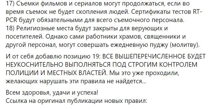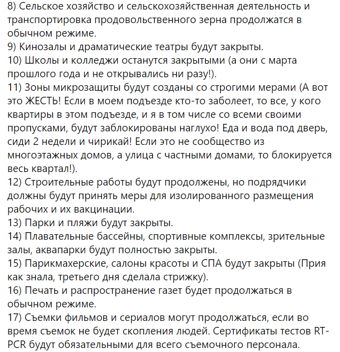 При этом разрешено вести сельскохозяйственную деятельность, строительные работы, печать и распространение газет - в обычном режиме. Дозволены съемки фильмов и сериалов без скопления людей и с обязательными сертификатами тестов для всего съемочного персонала. Все виды общественного и частного транспорта будут работать, как обычно, а вот для в такси квота - 50% пассажиров.