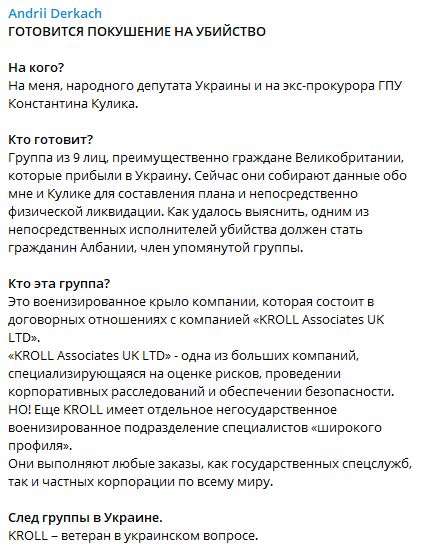 "KROLL Associates UK LTD" - одна из больших компаний, специализирующаяся на оценке рисков, проведении корпоративных расследований и обеспечении безопасности. Но еще KROLL имеет отдельное негосударственное военизированное подразделение специалистов "широкого профиля". Они выполняют любые заказы, как государственных спецслужб, так и частных корпорации по всему миру. KROLL - ветеран в украинском вопросе", - рассказал Деркач.