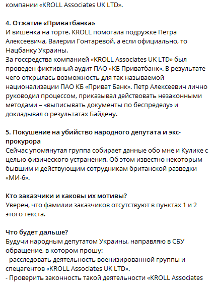 "Будучи народным депутатом Украины, направляю в СБУ обращение, в котором прошу: расследовать деятельность военизированной группы и спецагентов "KROLL Associates UK LTD", проверить законность такой деятельности "KROLL Associates UK LTD" на территории Украины", - добавил нардеп.