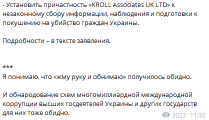 В связи с этим он обратился к Службе безопасности Украины с просьбой расследовать деятельность компании "KROLL".