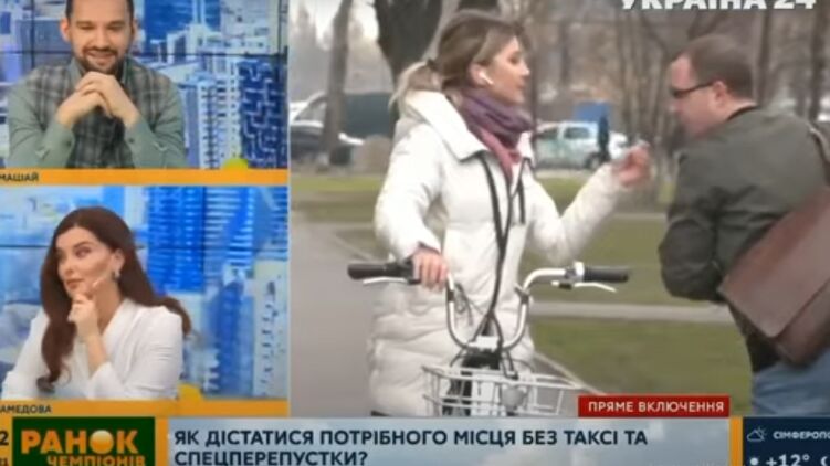 Инцидент произошел во время программы "Утро чемпионов" канала "Украина 24". В кадре корреспондент Лейла Мамедова обсуждает с другими ведущими разные способы, которыми можно передвигаться по Киеву во время ограниченной работы общественного транспорта.