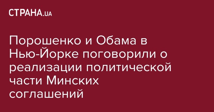 Президент Украины Петр Порошенко и президент США Барак Обама в рамках официальной встречи на полях Генассамблеи ООН в Нью-Йорке обсудили текущий этап реализации Минских соглашений. Об этом сообщает Интерфакс-Украина.