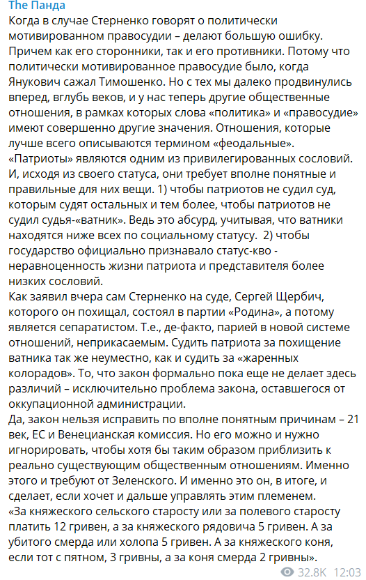 Как заявил вчера сам Стерненко на суде, Сергей Щербич, которого он похищал, состоял в партии "Родина", а потому является "сепаратистом". Т.е. де-факто парией в новой системе отношений, неприкасаемым. Судить "патриота" за похищение "ватника" так же неуместно, как и судить за "жаренных колорадов". То, что закон формально пока еще не делает здесь различий – исключительно проблема закона, оставшегося от "оккупационной администрации".