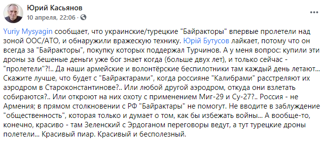 В комментариях у Касьянова начались споры. Упомянутый топикстартером главред "Цензора" Юрий Бутусов, который "топит" за применение "Байрактаров", заявил, что они отлично показали себя в Сирии и Карабахе. И могут бороться с российской ПВО.