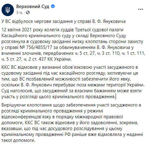 "ККС ВС отказал в признании обязательного участия осужденного в судебном заседании во время кассационного рассмотрения, мотивируя это тем, что ВС лишен возможности обеспечить его явку, поскольку В. Ф. Янукович находится за пределами территории Украины. Суд отметил, что осужденный по собственному желанию может принять участие в рассмотрении этого уголовного производства.