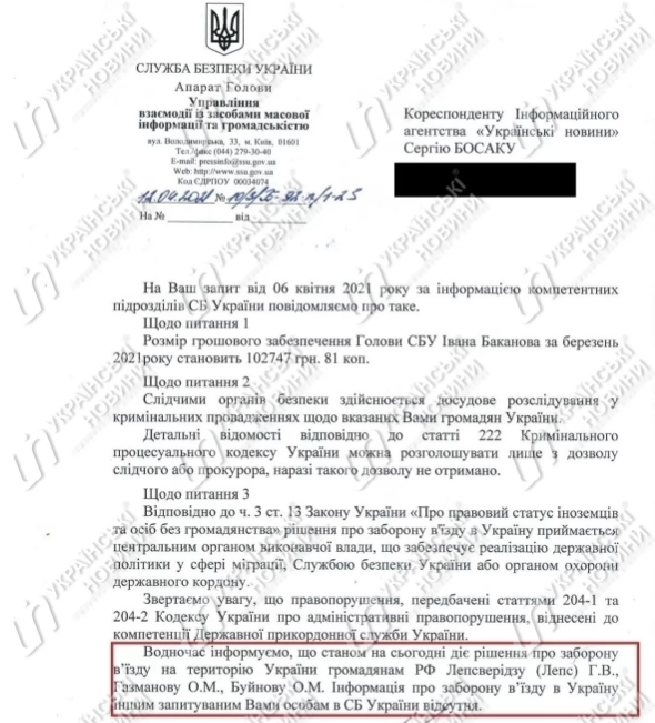 Об этом со ссылкой на ответ СБУ сообщают "Украинские новости" во вторник, 13 апреля.