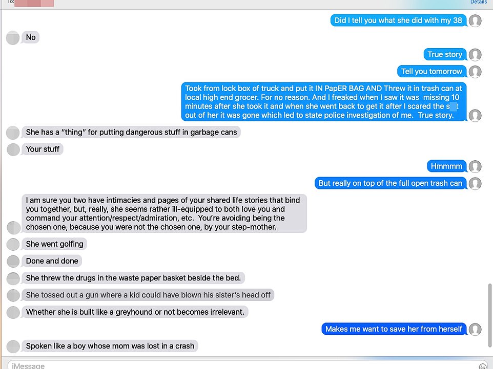 В сообщениях своему терапевту Хантер утверждал, что, когда копы Делавэра нашли пистолет, вмешались "ФБР и Секретная служба", и что Хэлли сказала офицерам, что выбросила оружие, потому что она "боялась за детей" и "потому что боялась, что я причиню себе вред из-за своих проблем с наркотиками и алкоголем".