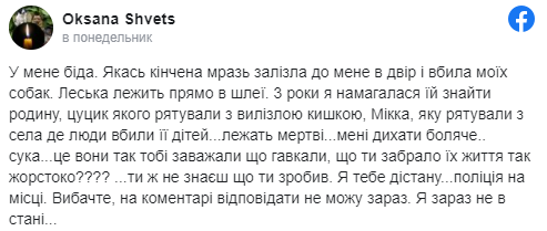 "Посмотрите на них. Эти собаки были такие веселые и непоседливые, прыгали на руки от радости и всех расцеловывали ... у меня дома жили животные счастливо и беззаботно, к ним приходили дети играть ... какой-то урод зашел во двор и они выбежали к нему махая хвостами, а оно взяло молоток и начало их бить ... кровь не только на металле, она на твоих руках, на твоей ничтожной душе", - написала женщина.