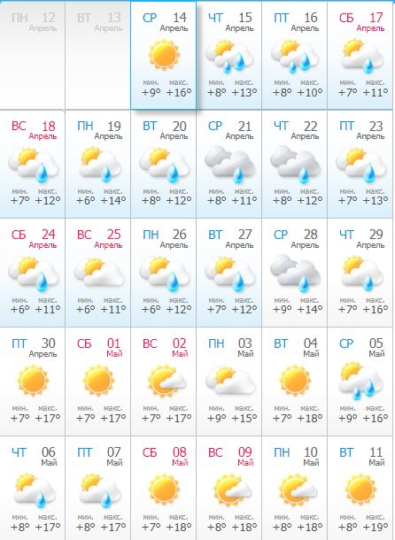 Зато с начала мая установятся солнечные дни. На майские праздники и Пасху 1 и 2 мая этот сайт прогнозирует солнце и до +17 днем.