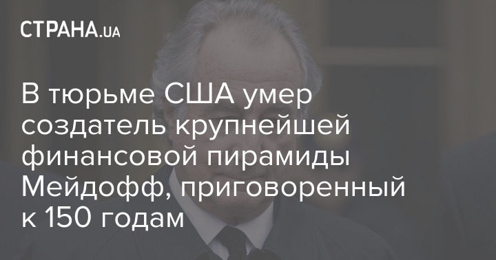 Организатор одной из крупнейших в истории финансовых пирамид Бернард Мейдофф умер в тюрьме Северной Каролины в возрасте 82 лет. Он отбывал 12-й год из своего 150-летнего срока заключения.