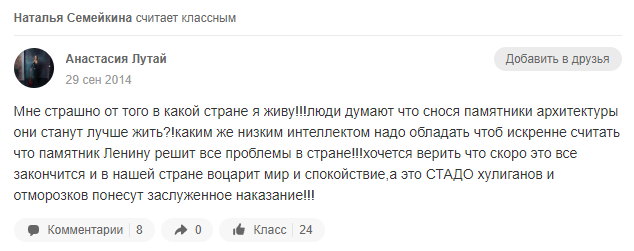 "Мне страшно от того, в какой стране я живу! Люди думают, что снося памятники архитектуры они станут лучше жить?! Каким же низким интеллектом надо обладать, чтобы искренне считать, что памятник Ленину решит все проблемы в стране! Хочется верить, что скоро это все закончится, и в нашей стране воцарит мир и спокойствие, а это стадо хулиганов и отморозков понесут заслуженное наказание!", - говорится в сообщении, датированном 29 сентября 2014 года, через день после того как на площади Свободы в Харькове повалили памятник Ленину.