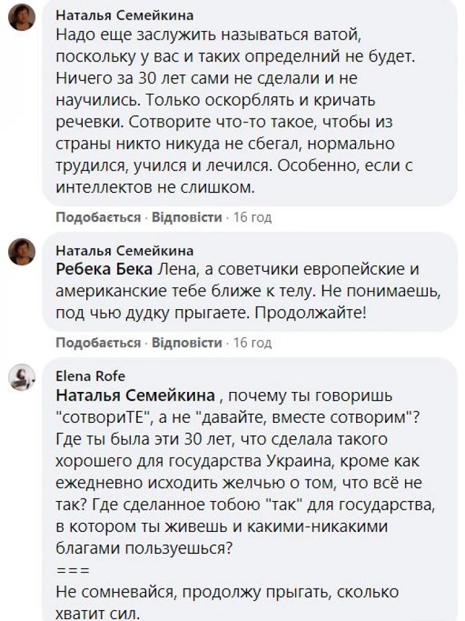 "Надо еще заслужить называться ватой, поскольку у вас и таких определений не будет. Ничего за 30 лет сами не сделали и не научились. Только оскорблять и кричать кричалки. Сотворите что-то такое, чтобы из страны никто никуда не сбегал, нормально трудился, учился и лечился. Особенно если с интеллектом не слишком".