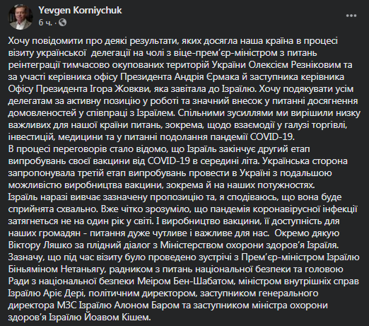 "В процессе переговоров стало известно, что Израиль заканчивает второй этап испытаний своей вакцины от Covid-19 в середине лета. Украинская сторона предложила третий этап испытаний провести в Украине с последующей возможностью производства вакцины, в том числе и на наших мощностях. Израиль пока изучает указанное предложение и, я надеюсь, что оно будет воспринято положительно", - написал Корнийчук.