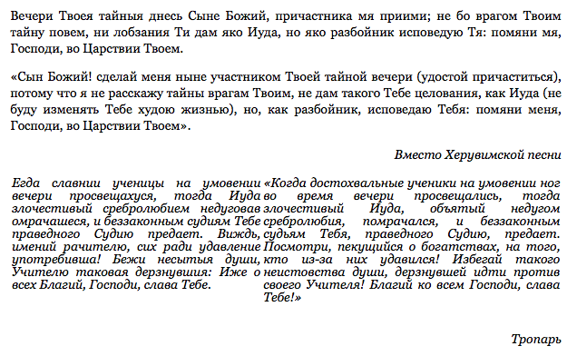 Молитвы и пост. Богослужения в этот день посвящены притчам и наставлениям, которые давал Иисус в Иерусалимском храме. Дома можно читать следующие песнопения и отрывки из Евангелия.