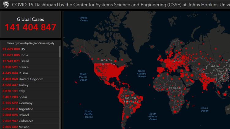 По состоянию на утро 19 апреля, число зараженных в мире перевалило за 141 миллион, фото: arcgis.com