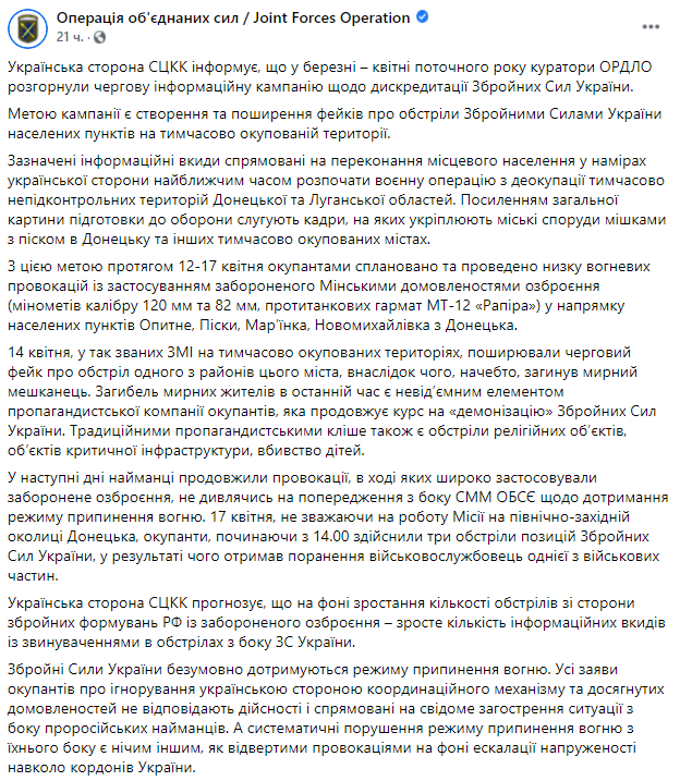 "14 апреля в так называемых СМИ на временно оккупированных территориях распространяли очередной фейк об обстреле одного из районов этого города, в результате чего якобы погиб мирный житель. Гибель мирных жителей в последнее время является неотъемлемым элементом пропагандистской компании оккупантов, которая продолжает курс на "демонизацию" Вооруженных Сил Украины", - говорится в заявлении штаба ООС.