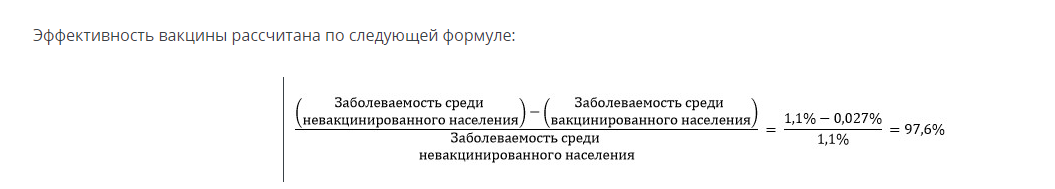 После того как вакцинировались 3,8 млн россиян в период с 5 декабря 2020 года по 31 марта 2021 года, заболеваемость Covid-19 начиная с 35-го дня с момента первого укола составила 0,027%. При этом заболеваемость среди тех, кто не делал прививку среди взрослого населения за вышеуказанный период с 35-го дня после запуска массовой гражданской вакцинации составила 1,1%.