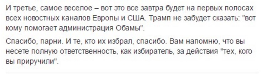 "Вы все будете завтра обсуждать драку Парасюка и Вилкула. Первое – Парасюк явно выбрал себе не того "очкарика". Этот кандидат в мастера спорта по самбо. На видео видно, как он сразу встал в стойку. Охрана. Думаю охрана у Вилкула сработала не достаточно. Они могли его заламать, а полиции сказать, что он хулиган. Ну не видели мы его удостоверение нардепа. А то, что он кричал, что нардеп..ну знаете, многие мужчины тоже кричат, что у них 25. И третье, самое веселое – вот это все завтра будет на первых полосах всех новостных каналов Европы и США. Трамп не забудет сказать: "вот кому помогает администрация Обамы". Спасибо, парни. И те, кто их избрал, спасибо. Вам напомню, что вы несете полную ответственность, как избиратель, за действия "тех, кого вы приручили", - пишет Дмитрий Раимов на своей странице в Facebook.