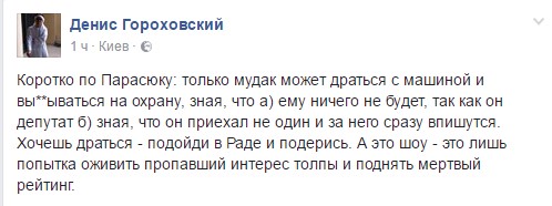"Коротко по Парасюку: только м...к может драться с машиной и вы**ываться на охрану, зная, что а) ему ничего не будет, так как он депутат б) зная, что он приехал не один и за него сразу впишутся. Хочешь драться - подойди в Раде и подерись. А это шоу - это лишь попытка оживить пропавший интерес толпы и поднять мертвый рейтинг", - пишет на своей странице в соцсети Facebook Денис Гороховский.