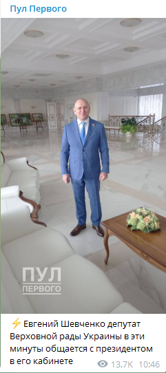"Евгений Шевченко, депутат Верховной Рады Украины, в эти минуты общается с президентом в его кабинете", - говорилось в заявлении телеграм-канала "Пул Первого", который ведет пресс-служба Лукашенко.