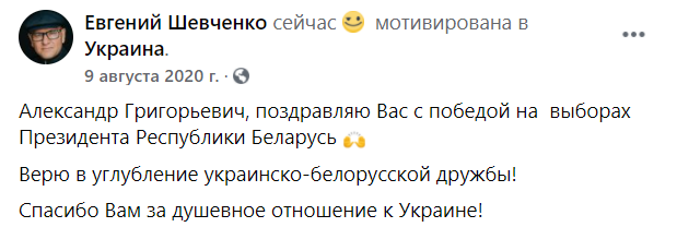 "Александр Григорьевич, поздравляю Вас с победой на выборах Президента Республики Беларусь. Верю в углубление украинско-белорусской дружбы! Спасибо Вам за душевное отношение к Украине!" - написал Шевченко. Он также утверждал, что белорусы протестуют якобы потому, что им "приелась стабильность".