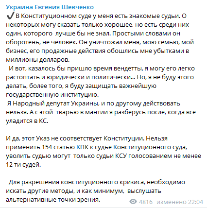 Также Евгений Шевченко был противником президентского указа об отстранении главы Конституционного суда Александра Тупицкого.