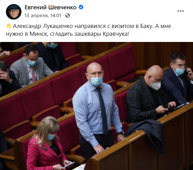 Насчет визита Шевченко в Минск озвучиваются разные мнения. Одни говорят, что это его персональный бунт против "Слуг" (тем более что во фракции уже имелись к нему нарекания). Другие считают, что происходящее - информационная спецоперация Офиса президента по отвлечению внимания от зашквара Николая Тищенко с его пирушкой во время локдауна в Киеве.