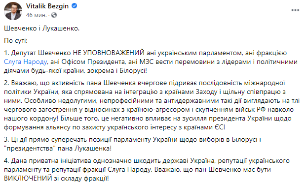 "Данная частная инициатива однозначно вредит государству Украина, репутации украинского парламента и репутации фракции Слуга Народа. Считаю, что господин Шевченко должен быть исключен из состава фракции!" - написал нардеп Виталий Безгин.