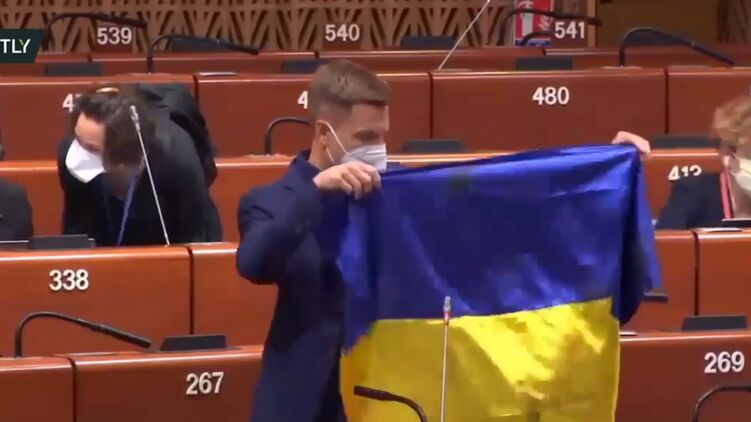 Во вторник, 20 апреля, народный депутат от "Евросолидарности" Алексей Гончаренко во время выступления на Парламентской ассамблее Совета Европы (ПАСЕ) достал простреленный на Донбассе флаг Украины, после чего ему выключили микрофон и лишили слова.