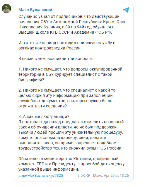"Случайно узнал от подписчиков, что действующий начальник СБУ в Автономной Республике Крым, Олег Николаевич Кулинич, с 1989 года по 1994 год обучался в Высшей школе КГБ СССР и Академии ФСБ РФ. И в этот же период проходил воинскую службу в органах контрразведки России.