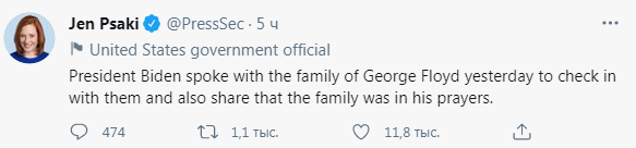 "Президент Байден поговорил с семьей Джорджа Флойда, чтобы выяснить, как они, и рассказать, что он молился о них", - написала Псаки.