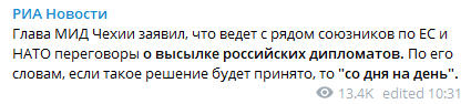 17 апреля стало известно, что из Праги высылают 18 российских дипломатов посольства РФ по подозрению в связях с разведкой России. Одновременно республика объявила в розыск двух российских разведчиков Александра Петрова и Руслана Боширова - их подозревают в причастности ко взрыву на складе боеприпасов во Врбетице.