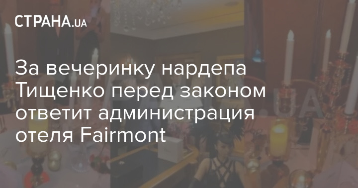 За организацию вечеринки, устроенную для супруги зампредседателя фракции "Слуг народа" Николая Тищенко в период строгого карантина, по законодательству будет отвечать администрация отеля Fairmont Grand Hotel Kyiv