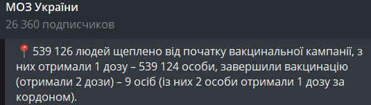 При этом только первую дозу получили более полумиллиона человек. А всего так или иначе укололись 539 126 украинцев.
