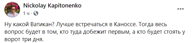 "Ну какой Ватикан? Лучше встречаться в Каноссе (это коммуна в Италии, а под выражением "идти в Каноссу" чаще понимают акт покаяния или покорности, также есть "каносское унижение", - Ред.). Тогда весь вопрос будет в том, кто туда добежит первым, а кто будет стоять у ворот три дня", - пишет директор Центра исследований международных отношений Николай Капитоненко.