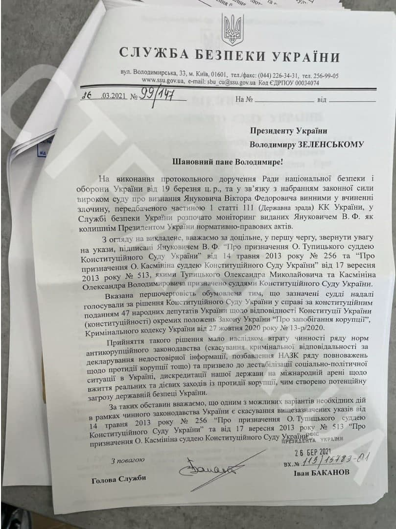 В распоряжении "Страны" оказалось то самое письмо СБУ к президенту Украины Владимиру Зеленскому, на основании которого были аннулированы указы о назначении судьями Конституционного суда Александра Тупицкого и Александра Касминина.
