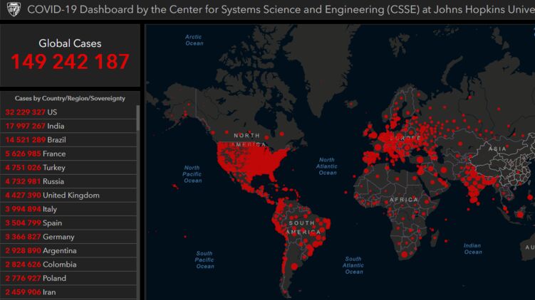 По состоянию на утро 29 апреля, число зараженных в мире перевалило за 149 миллионов, фото: arcgis.com