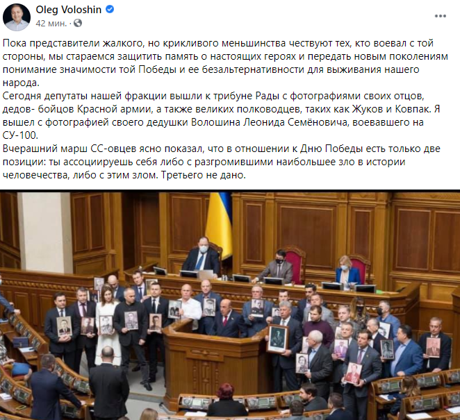 Сегодня депутаты нашей фракции вышли к трибуне Рады с фотографиями своих отцов, дедов - бойцов Красной армии, а также великих полководцев, таких как Жуков и Ковпак. Я вышел с фотографией своего дедушки Волошина Леонида Семёновича, воевавшего на СУ-100.