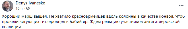 "Хороший марш вышел. Не хватило красноармейцев вдоль колонны в качестве конвоя. Чтоб провели зигующих гитлеровцев в Бабий Яр. Ждем реакцию участников антигитлеровской коалиции", - пишет журналист Денис Иванеско.