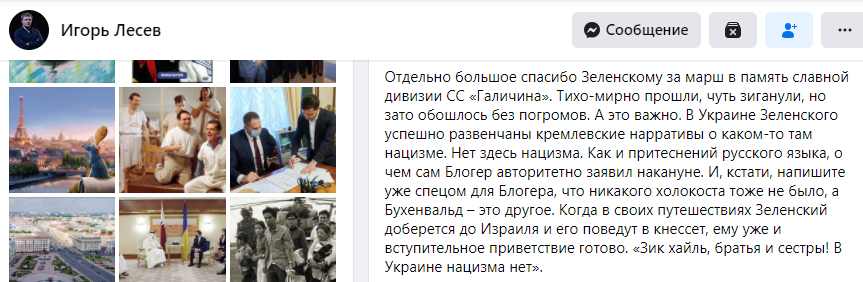 "Отдельно большое спасибо Зеленскому за марш в память славной дивизии СС "Галичина". Тихо-мирно прошли, чуть зиганули, но зато обошлось без погромов. А это важно. В Украине Зеленского успешно развенчаны кремлевские нарративы о каком-то там нацизме. Нет здесь нацизма. Как и притеснений русского языка, о чем сам Блогер авторитетно заявил накануне. И, кстати, напишите уже спецом для Блогера, что никакого холокоста тоже не было, а Бухенвальд – это другое. Когда в своих путешествиях Зеленский доберется до Израиля и его поведут в кнессет, ему уже и вступительное приветствие готово. "Зик хайль, братья и сестры! В Украине нацизма нет"".