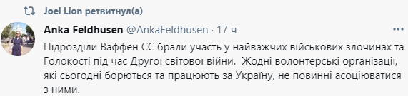 "Подразделения Ваффен CC участвовали в тяжелых военных преступлениях и Холокосте во время Второй мировой войны. Никакие волонтерские организации, которые сегодня борются и работают за Украину, не должны ассоциироваться с ними", - написала она в Твиттере.