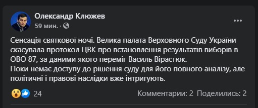 "Сенсация праздничной ночи. Большая палата Верховного Суда Украины отменила протокол ЦИК об установлении результатов выборов в Одномандатном избирательном округе 87, по данным которого победил Василий Вирастюк.