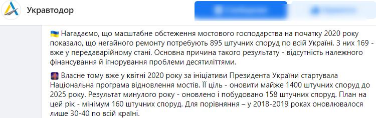 "Уставший" вчера мост, как признавал "Укравтодор" выше, был аварийным уже пять последних лет. Но почему-то в число реконструируемых за прошлый год не попал. При этом число отремонтированных на бумаге сооружений за 2020 год примерно равно числу по всем объектам, которые могут упасть в любой момент (158 из 169).