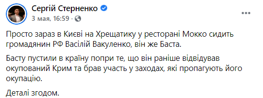 "Баста, он же Вакуленко. Следовательно этот черт в Киеве. Он же давал концерты в оккупированном Крыму. Сегодня его чуть не поймали на Крещатике, но убежал.