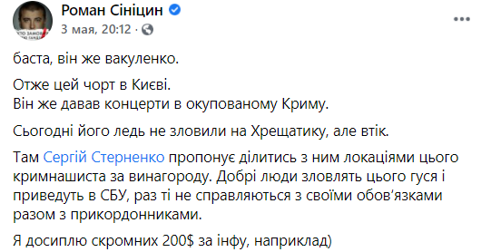 Там Сергей Стерненко предлагает делиться с ним локациями этого крымнашиста за вознаграждение. Добрые люди поймают этого гуся и приведут в СБУ, раз те не справляются со своими обязанностями вместе с пограничниками. Я досыплю скромных $200 за информацию, например", - пообещал на своей странице в Facebook Синицын.